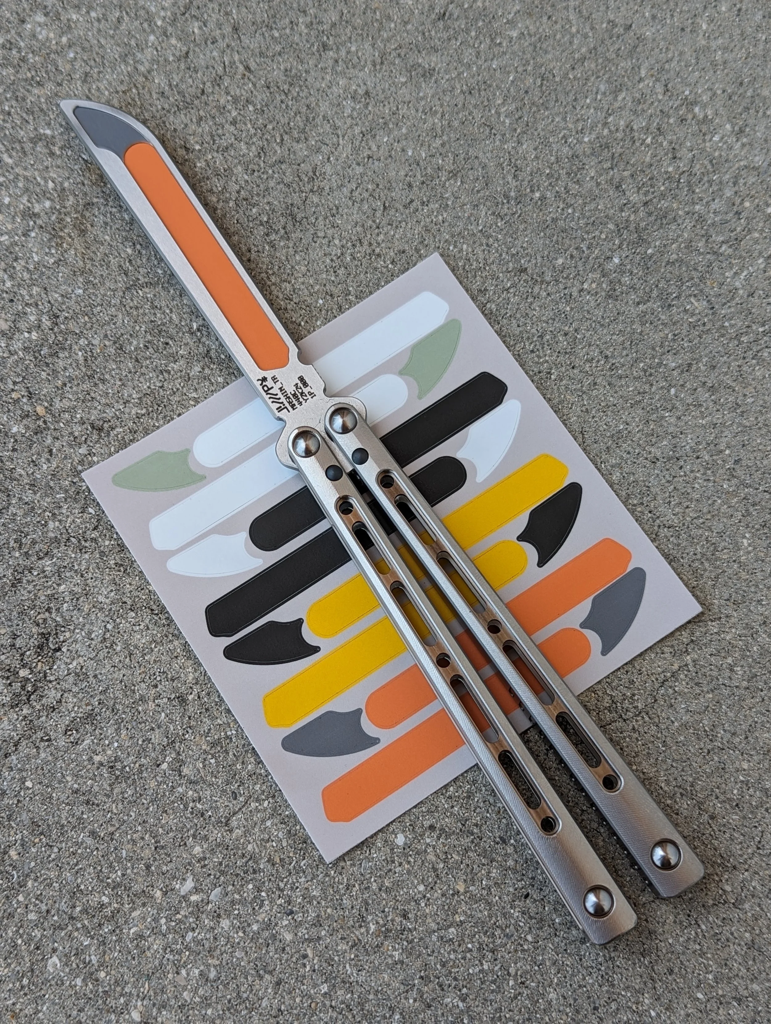 The Mashin-TR packs all of the fundamental community-preferred balisong features. 6AL-4V channel titanium handles, 440C stainless steel trainer blade, hand tuned bushings & washers, and zen pins. But as we all know, I couldn’t stop there. With the Mashin-TR, I wanted to develop a platform that accommodates all of the major balance preferences. That’s why I implemented an adjustable weight system that’s able to be incorporated into a channel handle design. You can rather quickly change the way the Mashin-TR flips by removing the screws at the rear of the handles, popping out the bolt, and adding/removing your preferred choice of weights. No bolts at the ends of the handles makes the Mashin-TR slightly blade heavy, which is perfect for those who perform a lot of fanning tricks. If you prefer a more neutral balance, using only the rear bolts as weigh will be your go-to configuration. And if you’re someone who prefers a bit of junk in the trunk, you can add either custom fit block spacers or even barrel spacers thanks to the unique expanded channel wall pocket milled inside of the channel handles. While most trainers feature hole patterns cut through the blade, the trainer blade on the Mashin-TR sets itself apart with it’s milled pockets designed to resemble the bevels of a hollow ground japanese tanto blade. These pockets allow you to customize the aesthetics of your Mashin-TR wiht the use of the included vinyl sticker inserts. Mix and match the tip and main bevel colorway to give your build a touch of personality. Aside from customization, these stickers also act as a visual indicator to those around you that you are flipping a trainer. Having colors on the “blade” make it pretty apparent that you are not out and about flipping a live blade balisong, which should help prevent against some very uncomfortable situations when flipping in a public setting. In terms of comfort, the Mashin-TR is as comfortable to flip as it can possibly get. There are no sharp edges to come into contact with on both the handles and the trainer blade with the exception of the bite handle indicator located on the tang of the blade (because that’s what a bite handle inidicator is for). Overall, the Mashin-TR is ideal for pretty much everyone. Whether you’re a beginner looking for a premium blaiong trainer or a long-standing member of the community looking to add another balisong to your arsenal, the Mashin-TR will not disappoint.